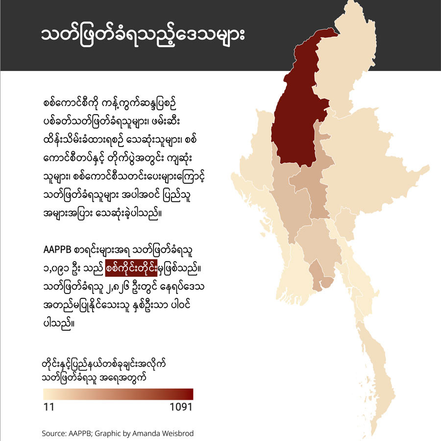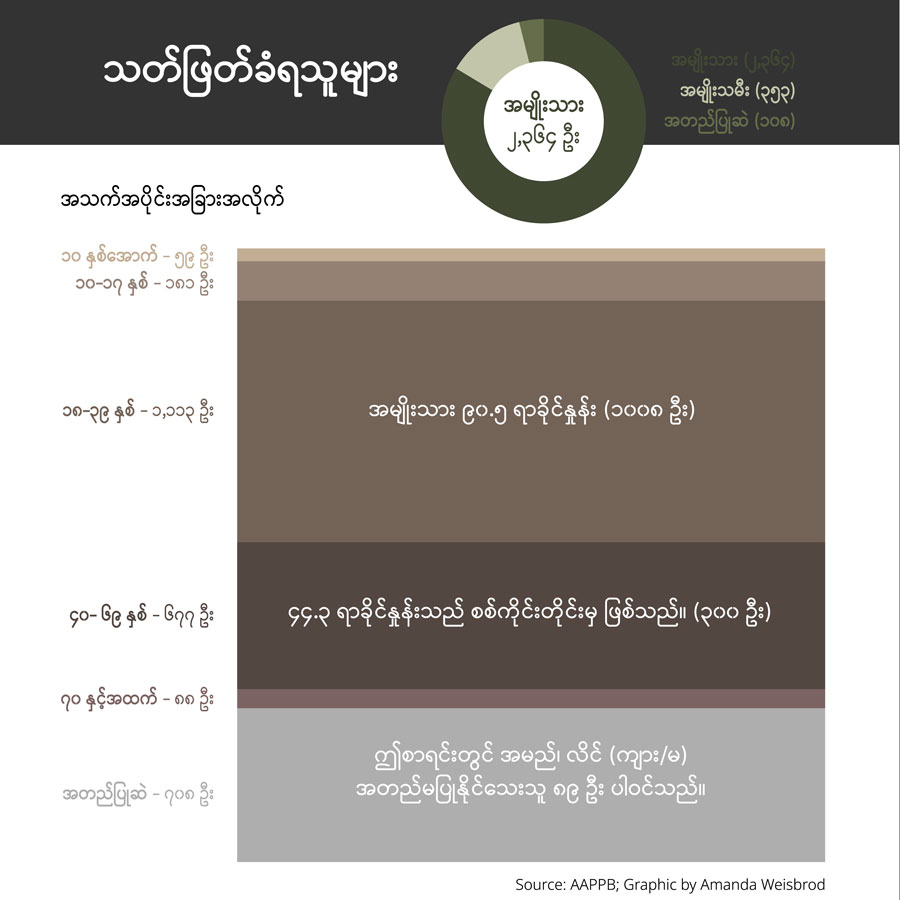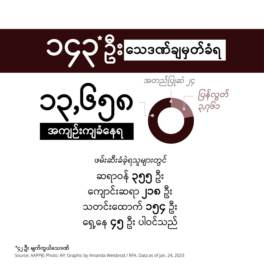 နိုင်ငံရေးအကျဉ်းသားများ ကူညီစောင့်ရှောက်ရေးအသင်း (AAPP) ရဲ့စာရင်းအရ… စစ်တပ်အာဏာသိမ်းကတည်းက လူပေါင်း ၁၇,၄၈၁ ယောက် အဖမ်းခံခဲ့ရပြီး အဲဒီထဲက ၁၃,၆၈၀ ဟာ အကျဉ်းထောင်အသီးသီးမှာ ထိန်းသိမ်းခံနေရတယ်လို့ သိရပါတယ်။ အဖမ်းခံထားရသူတွေထဲမှာ ၁၉၉၀ ပြည့်နှစ်၊ ၂၀၁၅ ခုနှစ်နဲ့ ၂၀၂၀ ပြည့်နှစ် အထွေထွေရွေးကောက်ပွဲ သုံးခုစလုံးမှာ အပြတ်အသတ်အနိုင်ရခဲ့တဲ့ အမျိုးသားဒီမိုကရေစီအဖွဲ့ချုပ် ခေါင်းဆောင်တွေလည်း ပါဝင်ပါတယ်။
