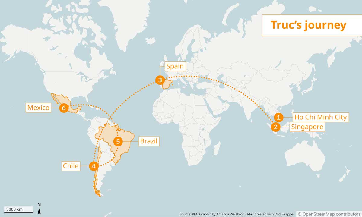 Truc’s journey began in April 2023, when she and three other women flew from Ho Chi Minh City to Singapore, then to Spain and then Chile.